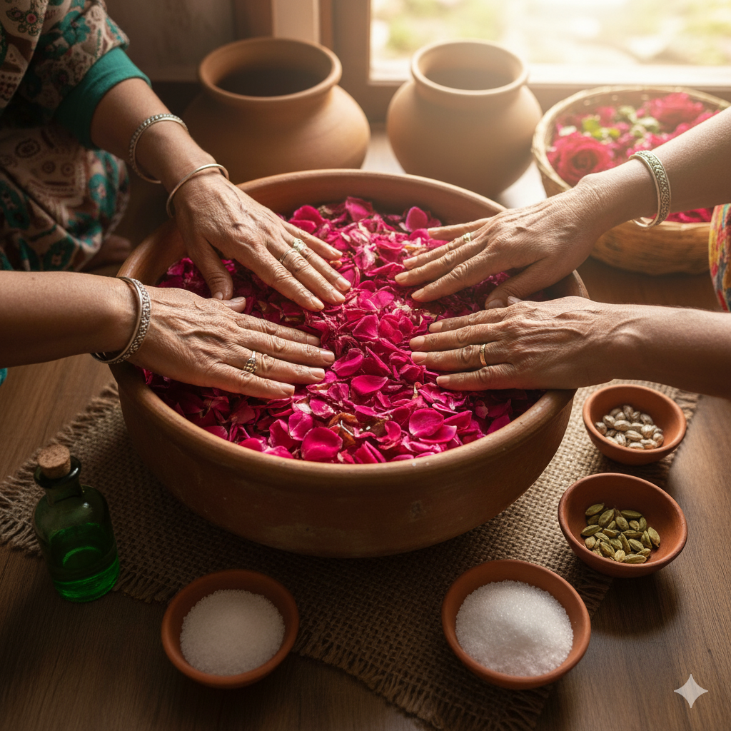 In her time, skincare was not about brands and bottles. She made rose water herself — pure, gentle, and real — because that’s what she trusted.
